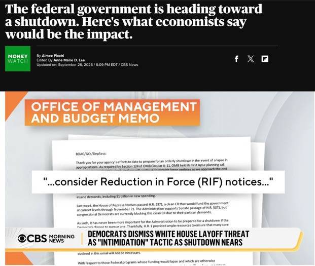 但就在这一关键时刻,白宫又横生枝节。白宫管理和预算办公室9月25日下令各机构为裁员(Reduction in Force,RIF)做准备,而不仅是以往惯常的非必要岗位人员无薪休假。“RIF”是美国政府人事和劳动管理领域的术语,通常指因经费、编制、机构调整等原因进行的裁员、精简人员、撤销岗位。因此,此举既是应急方案,也被视为向国会施压。如果继续僵持,后果可能不只是短暂停工,还包括机构和雇员结构的永久变化。